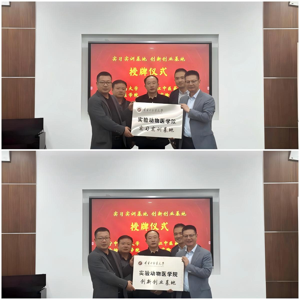 在授牌环节,赵相轩院长代表实验动物医学院向中心正式颁授“辽宁中医药大学实验动物医学院实习实训基地”与“辽宁中医药大学实验动物医学院创新创业基地”牌匾。