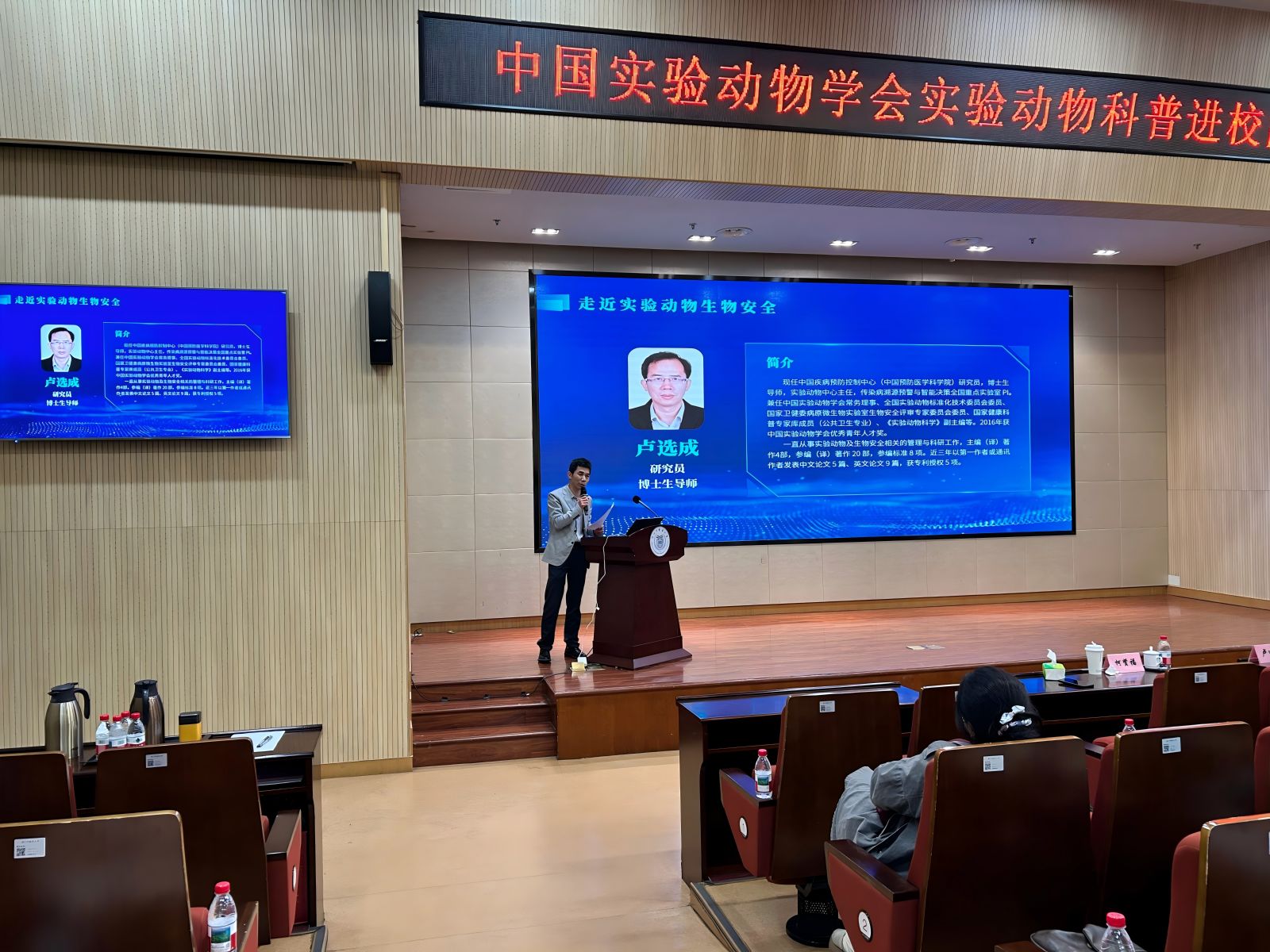 活动特邀两位国内知名专家作专题报告。中国疾病预防控制中心(中国预防医学科学院)研究员、实验动物中心主任卢选成以《实验动物生物安全》为题,结合国内典型案例,系统阐述了实验室生物安全的法规体系与风险评估要点。他详细讲解了在涉及致病性病原体的动物实验中,如何通过规范管理、安全防护和应急处置来保障人员与环境安全,为我校研究生增强了生物安全的风险防范意识。
